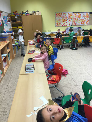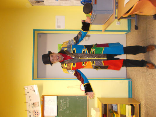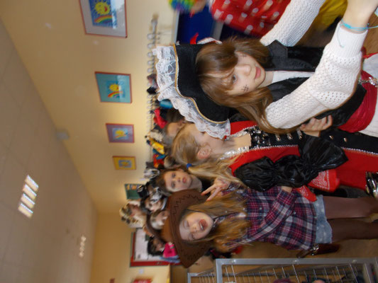 Als erstes tanzten wir den Piratentanz! Alle machten mit! Ein großer Spaß! Dann gab es die Modenschau und jeder präsentierte sein Kostüm!